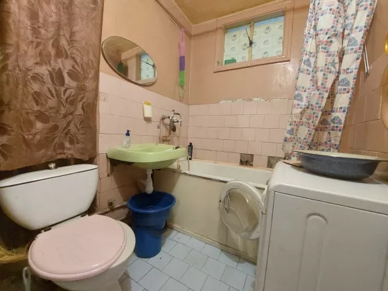 Санузел совмещен, стены покрашены краской, сантехника в рабочем состоянии, установлены приборы учета.