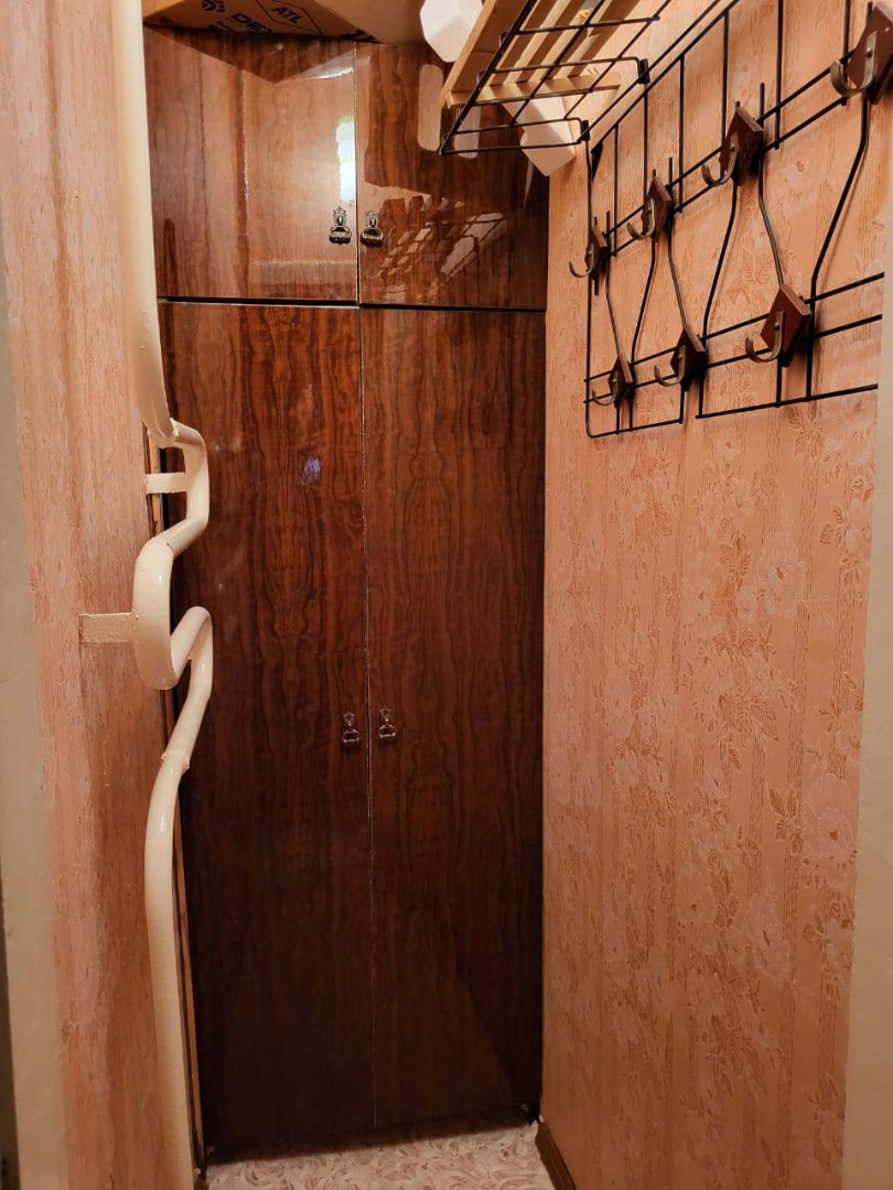 В квартире сделан косметический ремонт. Входная и межкомнатные двери старого образца, окна дерево. Имееется вместительная кладовка. На стенах обои. На полу постелен линолеум. На потолке потолочная плитка. Санузел совмещен, облицован кафельной плиткой, сантехник ника в рабочем состоянии. Установлены приборы учёта.