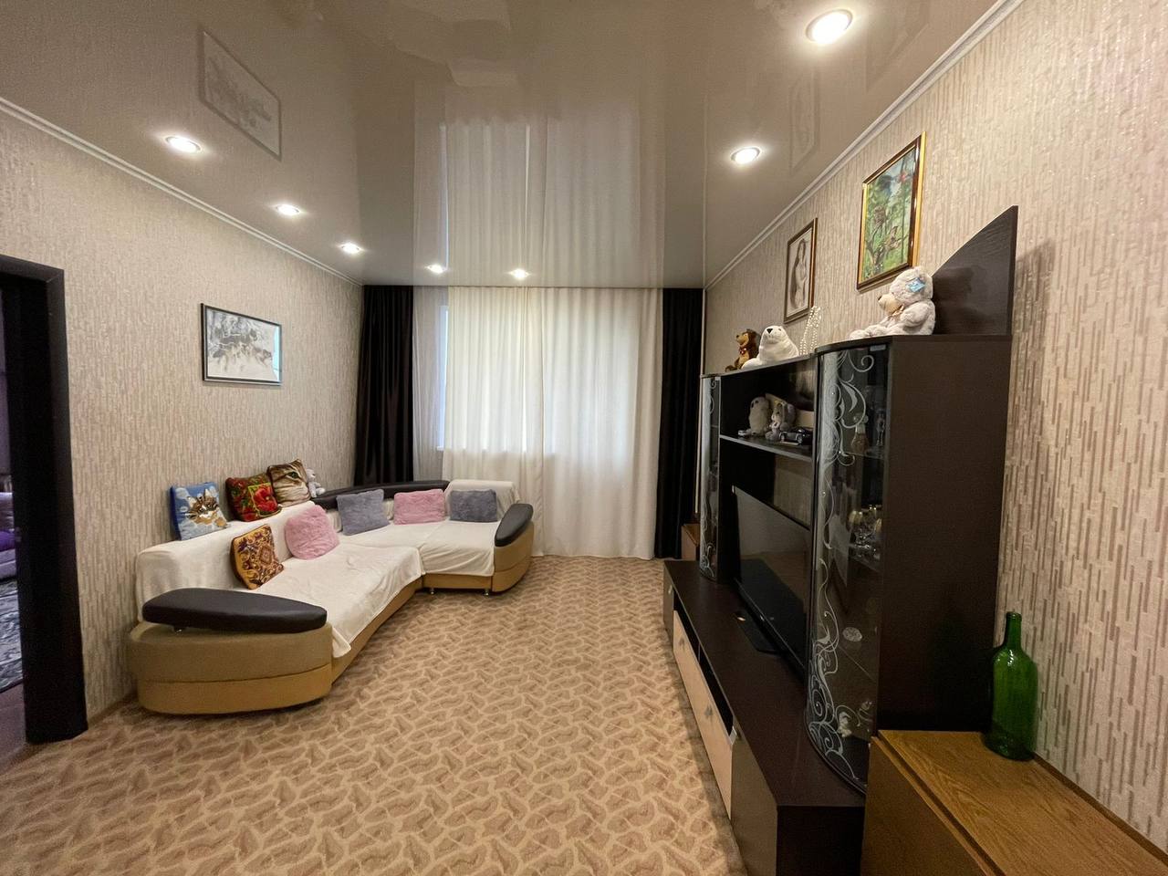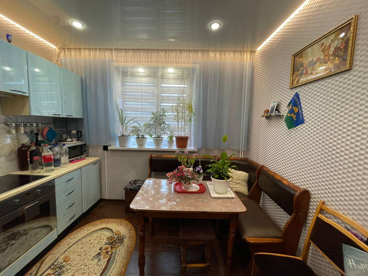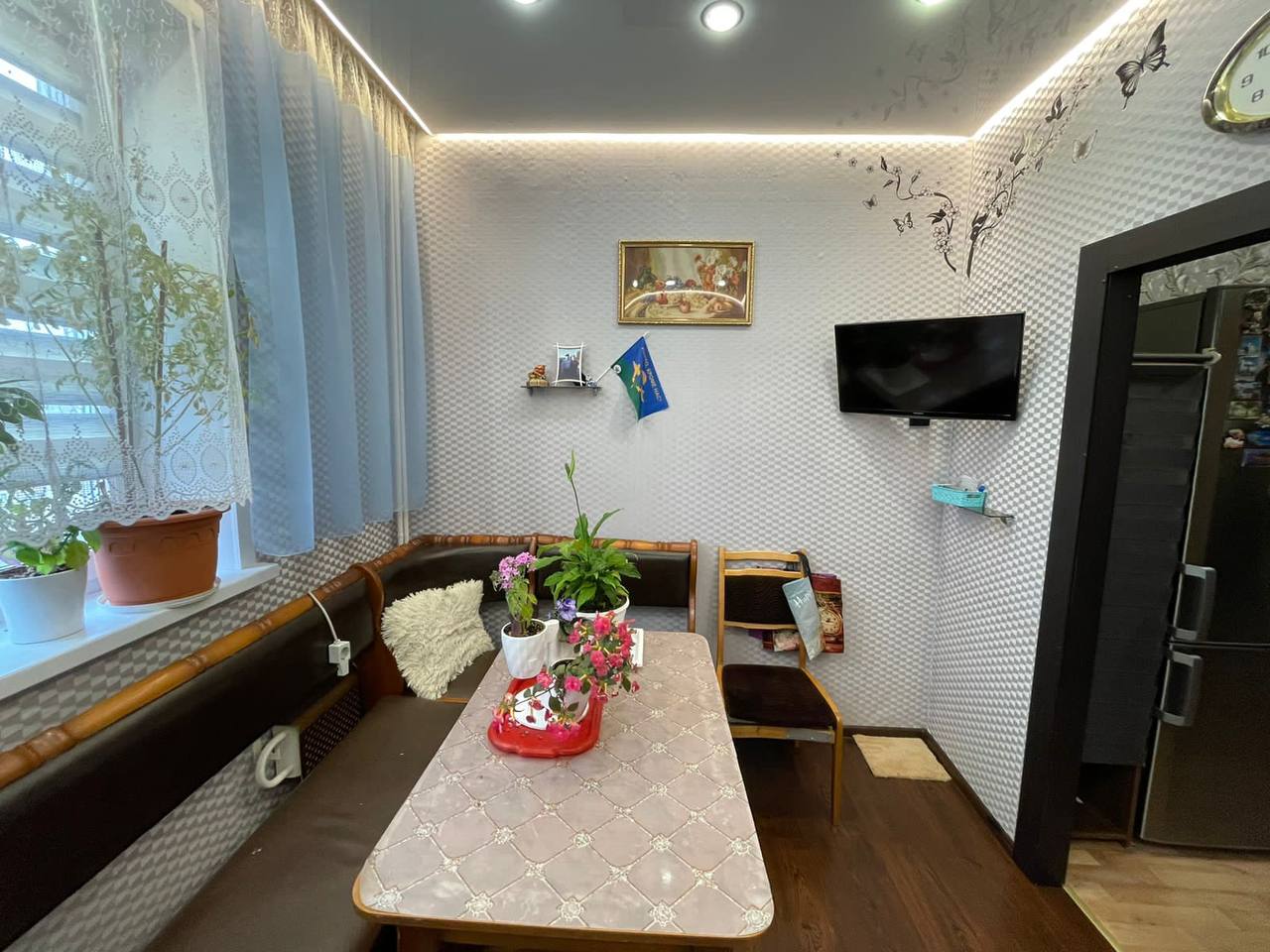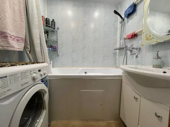 В квартире сделан косметический ремонт, входная и межкомнатные двери нового образца, окна ПВХ, балкон застеклен, во всех комнатах натяжные потолки, на кухне имеется пол с подогревом, вся электрика и сантехника новая. Санузел совмещен, облицован панелями ПВХ, установлены приборы учета.